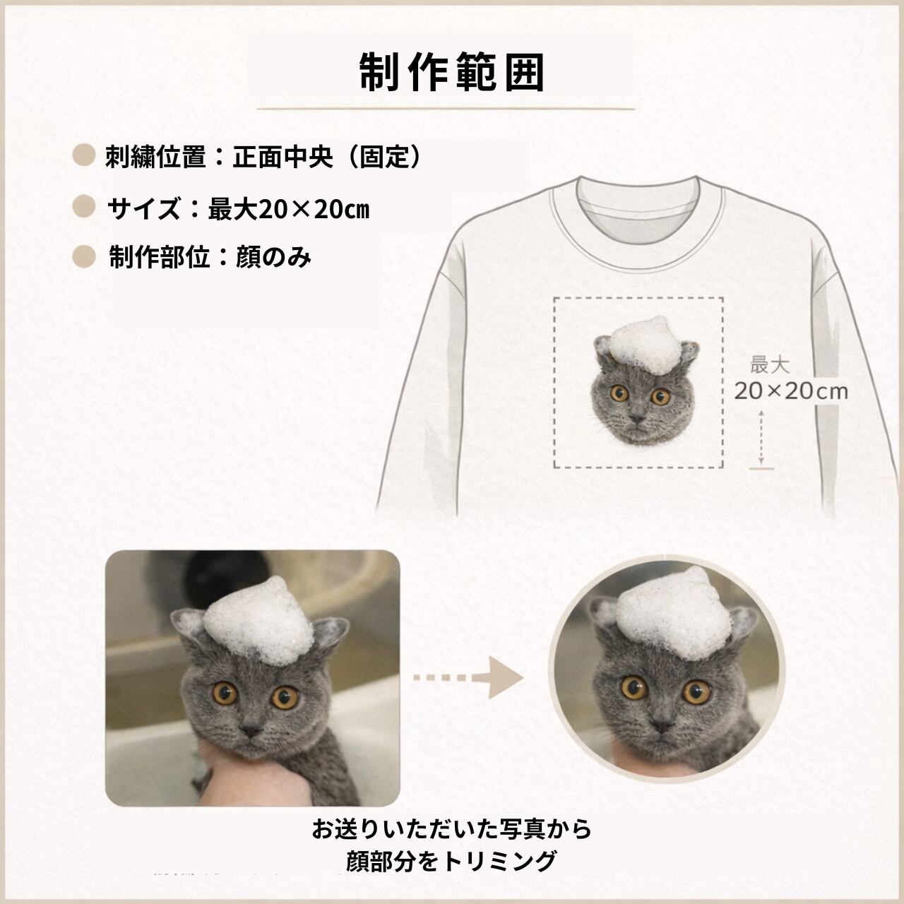 ・刺繍は「顔のみ」を制作対象とします(当店にて顔が主役になるようトリミング・調整します)。