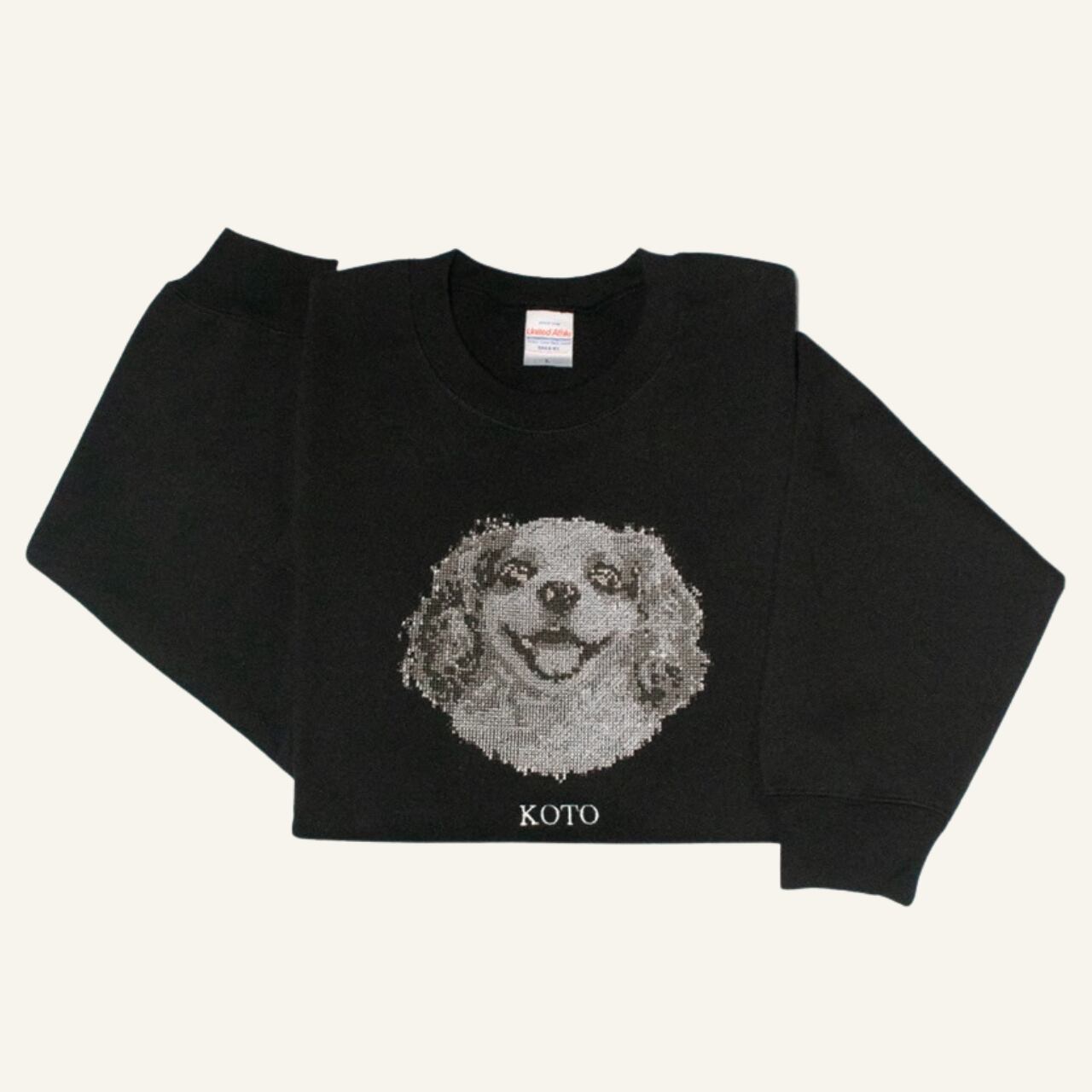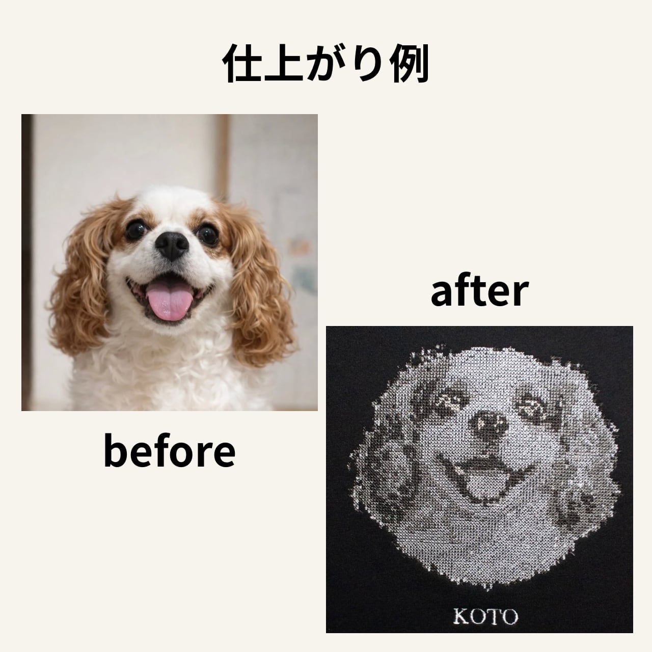本商品は、お客さまの写真をもとにクロスステッチ(ドット風)×モノクロ表現で刺繍し、スウェットに仕立てるオーダー刺繍です。